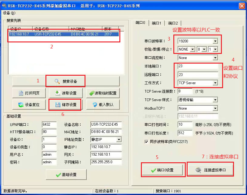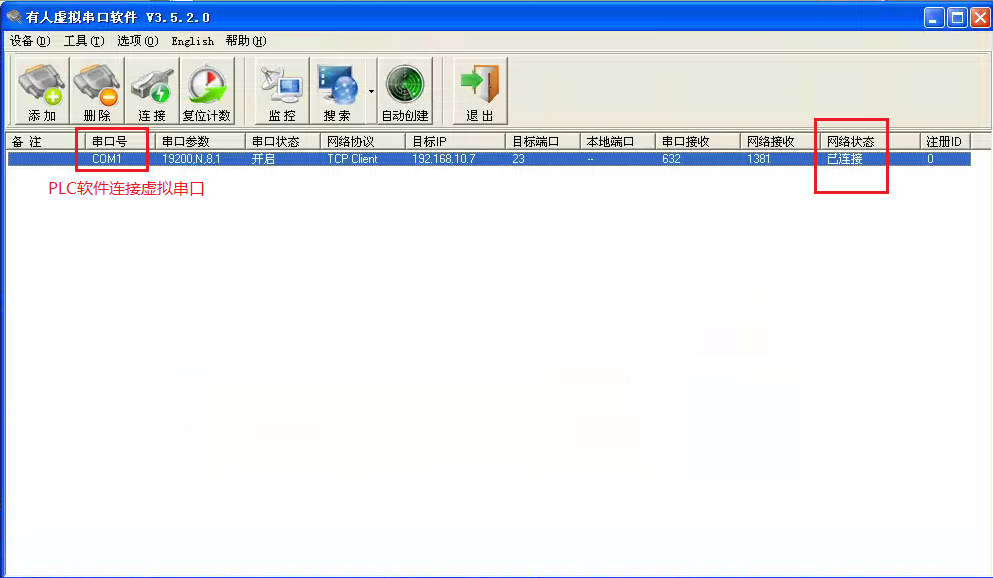 3:PLC串口直連電腦通信測試成功,將PLC連接串口服務器串口,使用串口服務器配合虛擬串口軟件通信。添加虛擬串口,設置串口服務器參數。