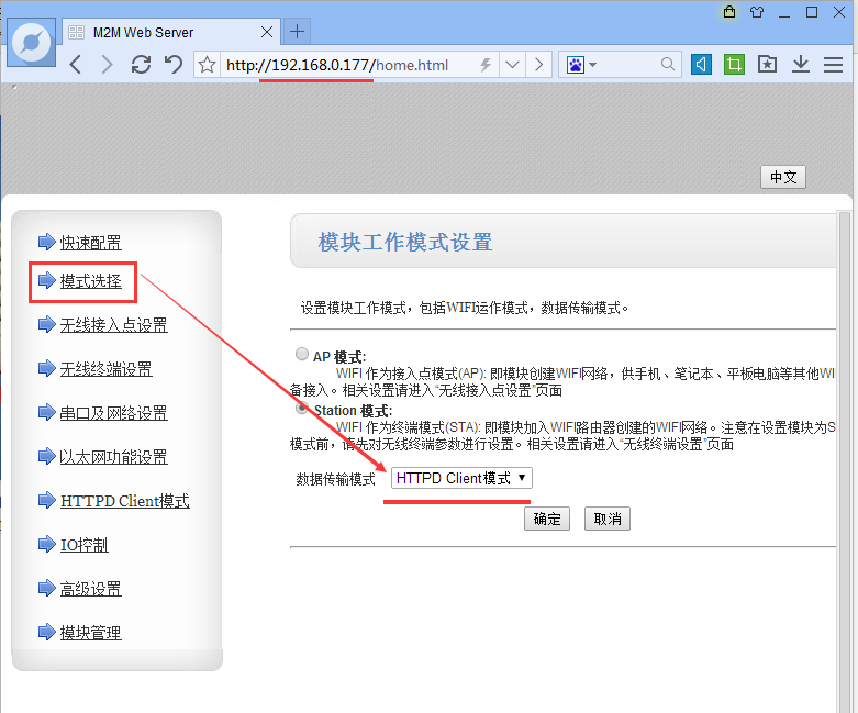 7:然后進(jìn)入WiFi模塊的配置網(wǎng)頁(yè),把模塊配置為HTTPD_client協(xié)議。