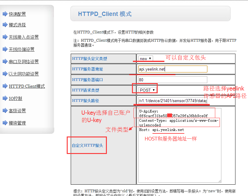 8:設(shè)置HTTP提交的格式。設(shè)置:自定義包頭,設(shè)置U-ApiKey為自己賬號(hào)的KEY, 設(shè)置Content-Type ,Host為api.yeelink.net.