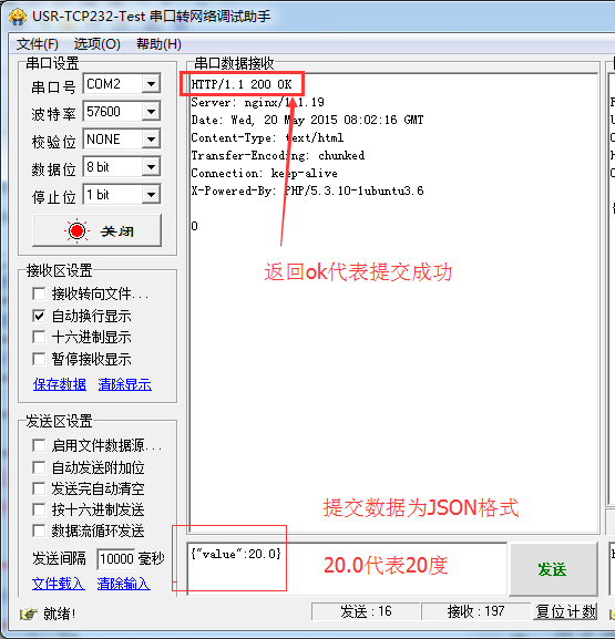 10:將WiFi模塊的串口連接到電腦串口,使用串口調(diào)試助手發(fā)送提交數(shù)據(jù)。使用串口發(fā)送提交的數(shù)據(jù)。提交數(shù)據(jù)按照J(rèn)SON格式提交。