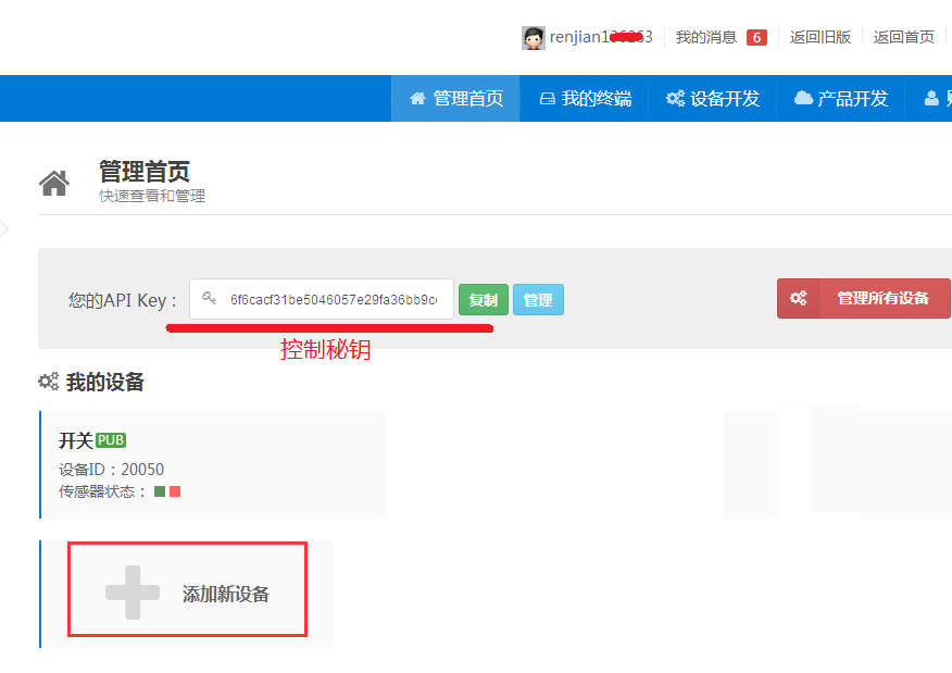 登陸自己賬號(hào)后,系統(tǒng)自動(dòng)生成API KEY秘鑰,用戶WiFi模塊通信時(shí)提交的驗(yàn)證。點(diǎn)擊添加新設(shè)備。