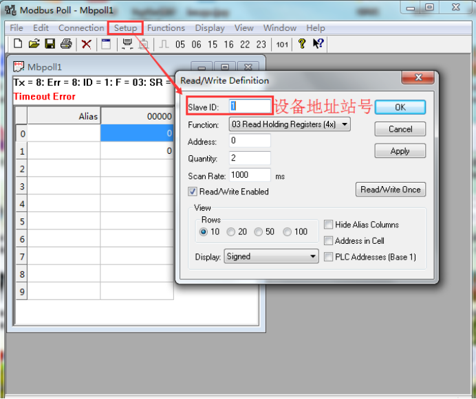 (1)創建頁面之后選擇SetupRead/write Definition選項添加從設備站號設置溫濕度模塊1的地址。