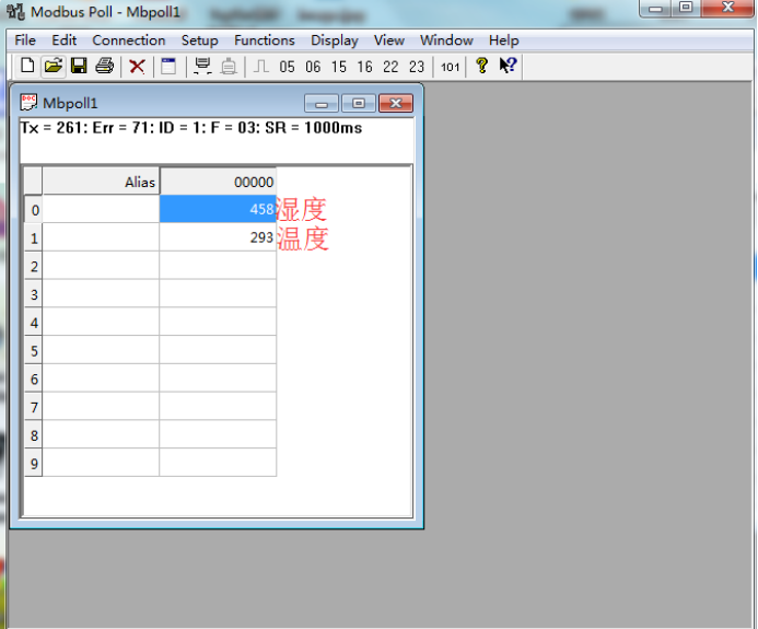 設置完成點擊OK,將顯示定義的寄存器列表以及讀取到溫濕度設備1的溫濕度數據。