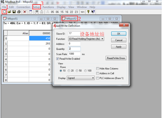(1)Address為寄存器起始地址,默認從1開始,對應MCGS的寄存器地址。