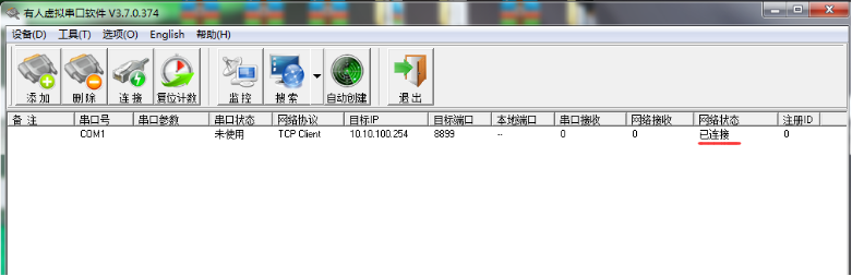 i)已添加COM口連接到模塊后,虛擬串口軟件上的網絡狀態會顯示已連接。如網絡狀態顯示連接失敗,請將604模塊恢復默認設置并重復上述步驟。