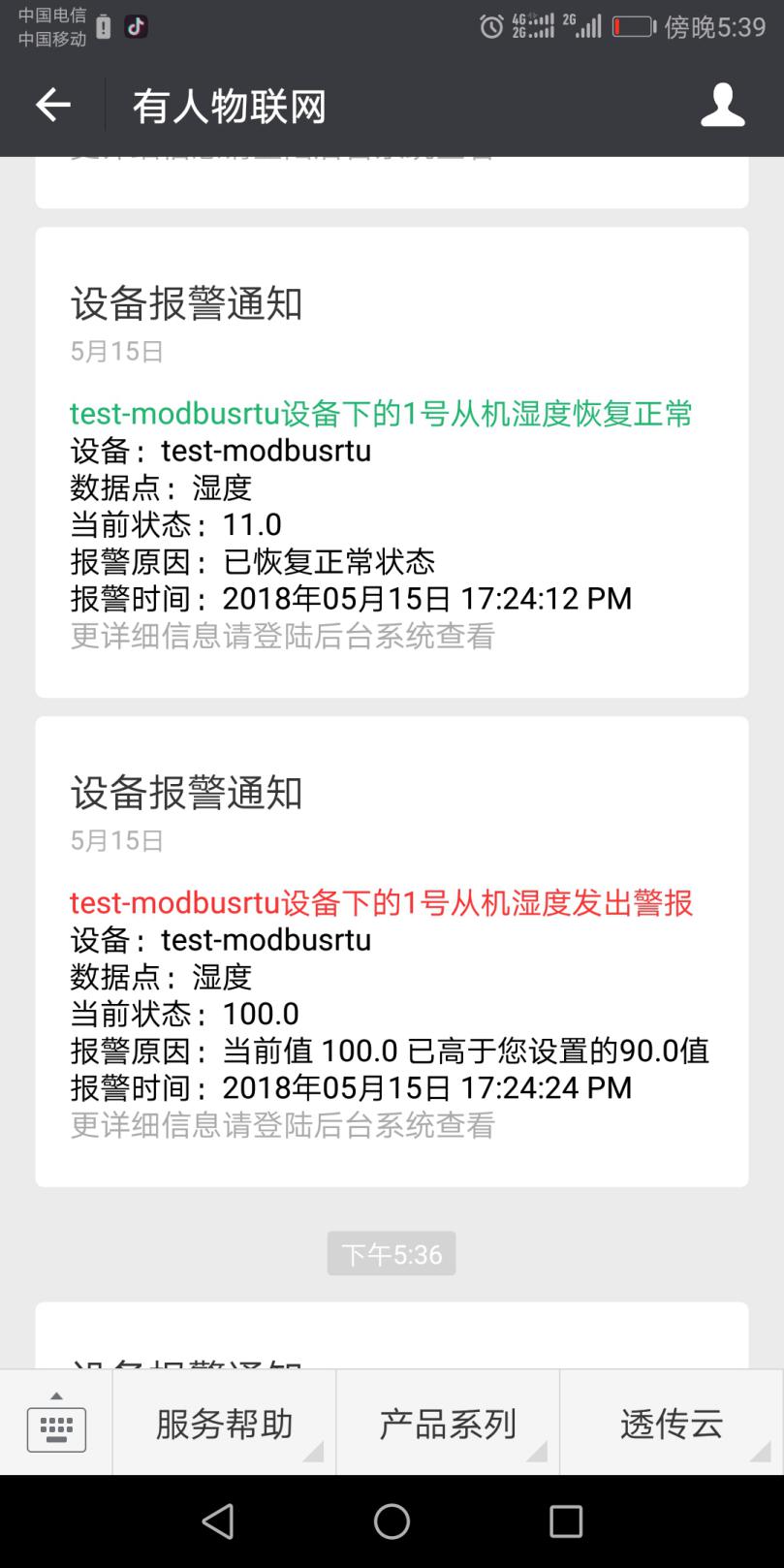 12、關注有人物聯網公眾號,點擊右下角透傳云,登錄賬號,報警信息可以推送至微信