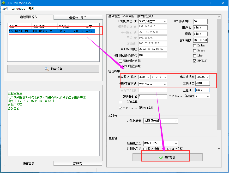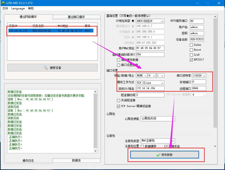 2、以太網(wǎng)模塊S2做tcp client:目標(biāo)ip/域名填:電腦IP172.16.14.154,遠(yuǎn)程端口填虛擬串口的端口8866