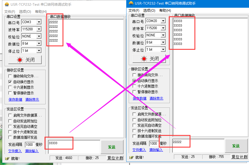同時(shí)打開(kāi)兩個(gè)串口轉(zhuǎn)網(wǎng)絡(luò)助手軟件。一個(gè)選擇虛擬串口com20,一個(gè)選擇實(shí)際串口COM3,即可進(jìn)行收發(fā)測(cè)試