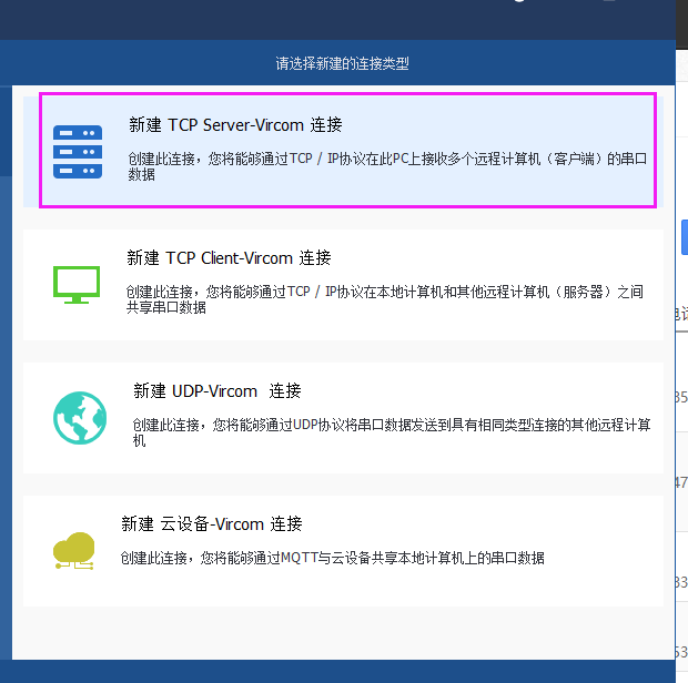 打開(kāi)下載好的VCOM軟件,點(diǎn)擊新建TCP-Server-Vircom連接