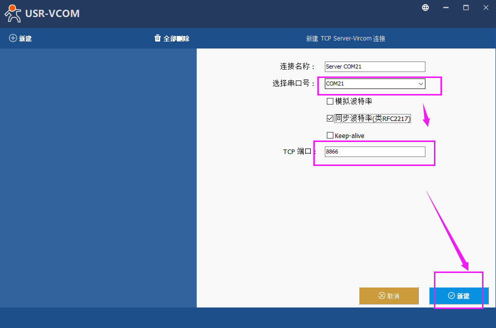 選擇一個(gè)沒(méi)有使用的串口號(hào),TCP端口設(shè)置成8866