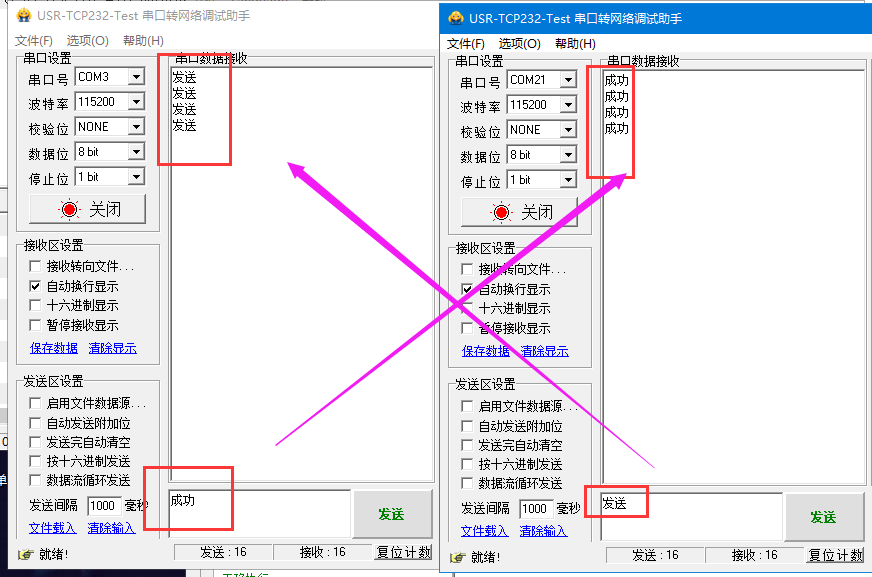 同時(shí)打開(kāi)兩個(gè)串口轉(zhuǎn)網(wǎng)絡(luò)助手軟件。一個(gè)選擇虛擬串口com21,一個(gè)選擇實(shí)際串口COM3,即可進(jìn)行收發(fā)測(cè)試
