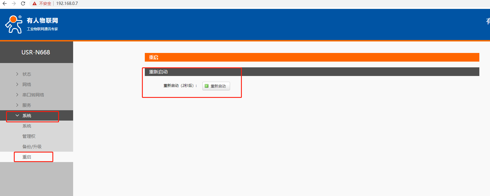 4、打開(kāi)瀏覽器,瀏覽器輸入IP:192.168.0.7進(jìn)入N668的內(nèi)置網(wǎng)頁(yè),用戶名密碼默認(rèn)為admin,模塊工作方式設(shè)為T(mén)CP SERVER,本地端口5523,點(diǎn)擊保存參數(shù)。重啟設(shè)備完成設(shè)置。