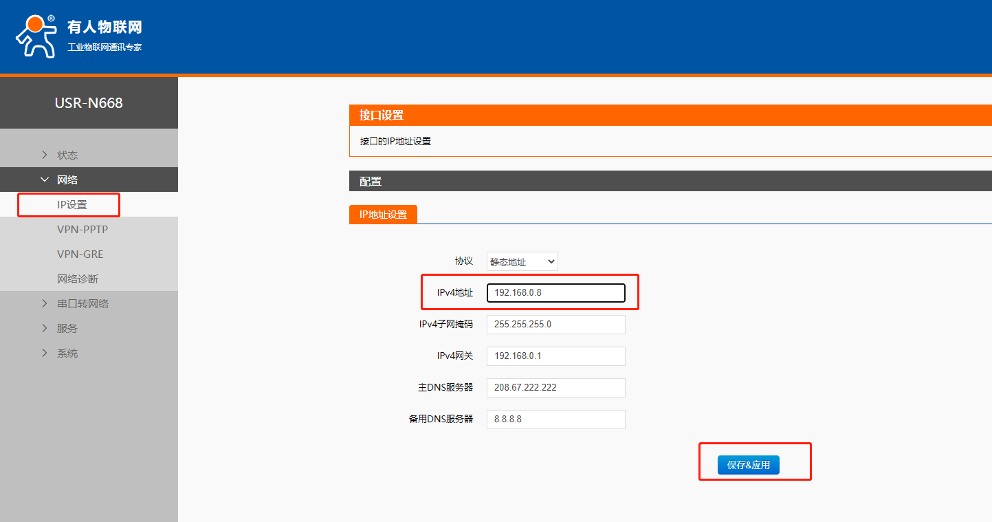 5、通過(guò)內(nèi)置網(wǎng)頁(yè)進(jìn)入另一臺(tái)N668的配置,點(diǎn)為了防止IP沖突,將此設(shè)備IP修改為192.168.0.8,模塊工作方式設(shè)為T(mén)CP Client,本地端口0,遠(yuǎn)程端口5523,點(diǎn)擊保存參數(shù)。