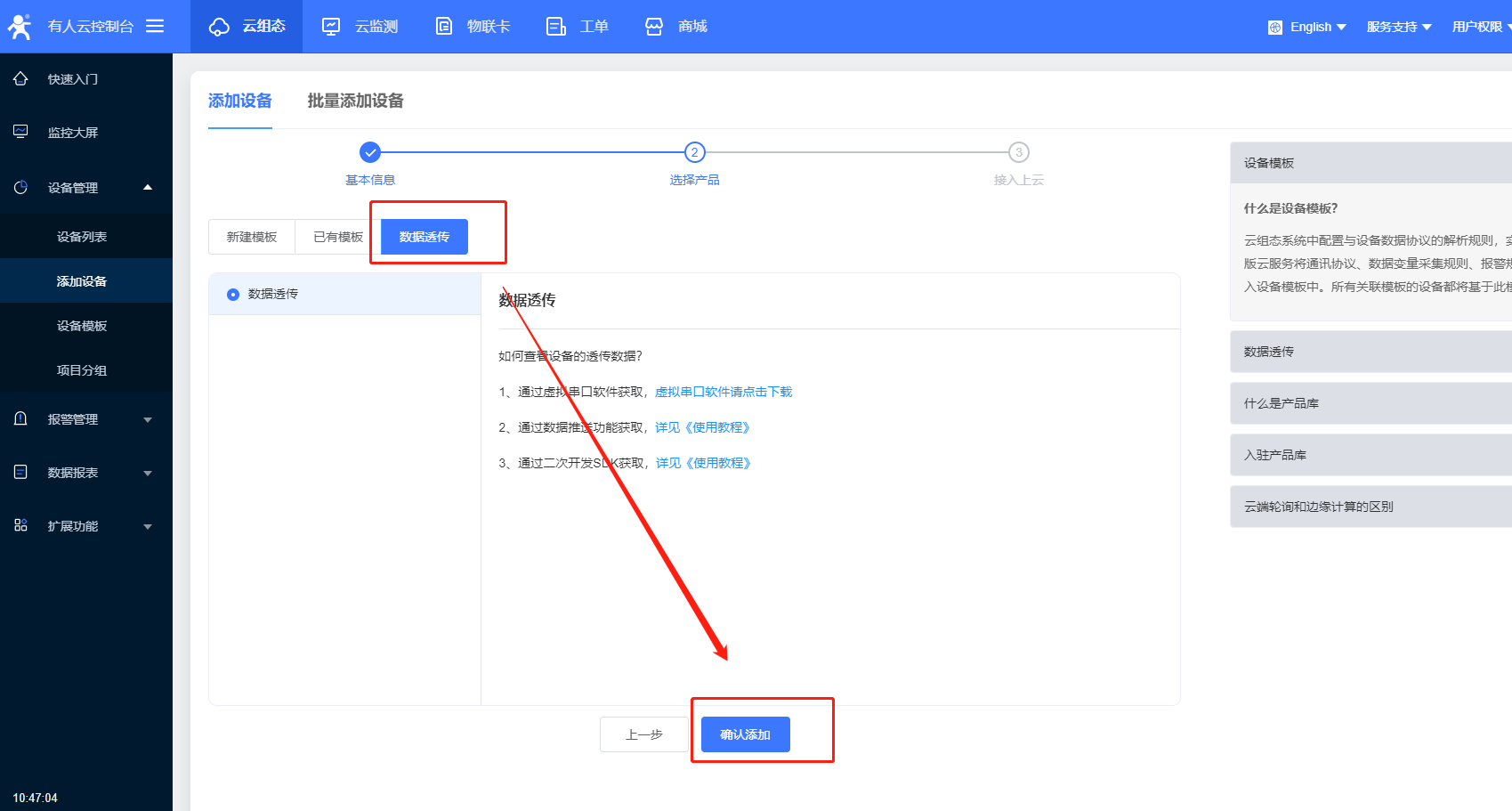 5.可以在這里看到默認生成的設備編號和通信密碼,點擊完成,云端成功添加設備