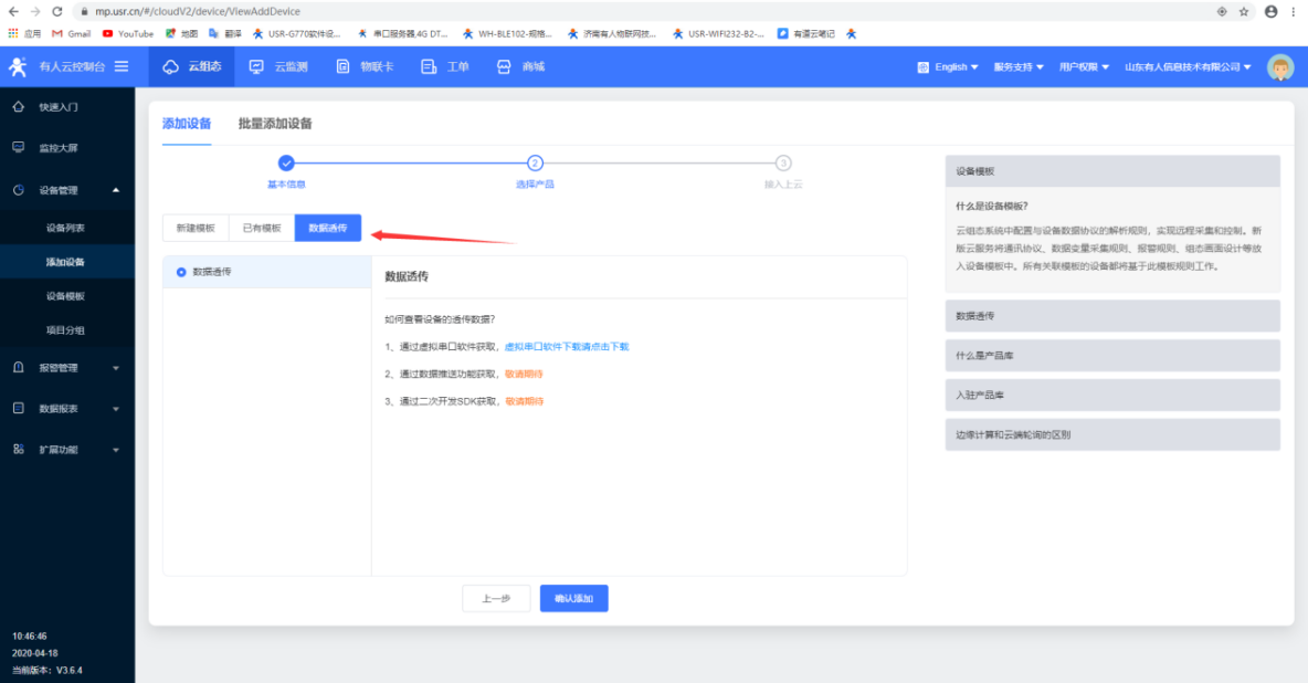 1.點擊添加設備,添加虛擬串口,點擊沒有SN,默認生成設備編號和密碼