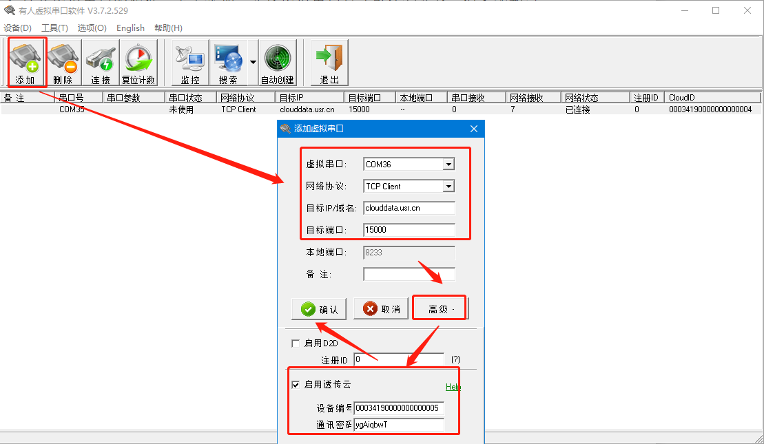 點擊高級,將云上生成的設備編號和密碼填入,點擊確定,生成虛擬串口