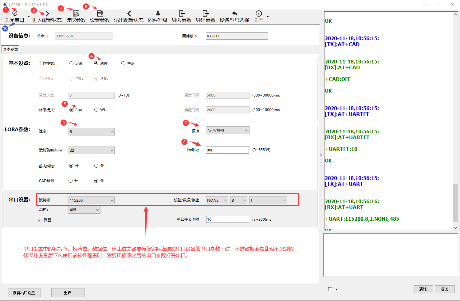 打開LoRa設置軟件,選擇LG206-L-P-H10, 依次點擊打開串口(選擇A、B對應的串口號,206默認串口參數(shù):115200,None,8,1,NFC)、進入配置狀態(tài)、讀取參數(shù)、配置速率等級8,信道72,目標地址888, 串口設置中的參數(shù)配置為您實際要連接的串口設備的串口參數(shù), 一鍵設置所有參數(shù),關閉LoRa設置軟件。