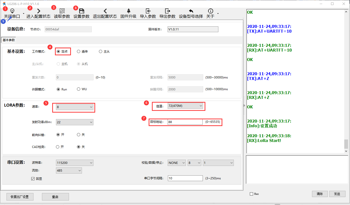 打開LoRa設置軟件→ 選擇LG206-L-P-H10 → 依次點擊打開串口(選擇A、B對應的串口號,串口參數:115200,None,8,1,NFC) → 進入配置狀態 → 讀取參數 → 配置圖中的參數 → 一鍵設置所有參數 → 關閉LoRa設置軟件。