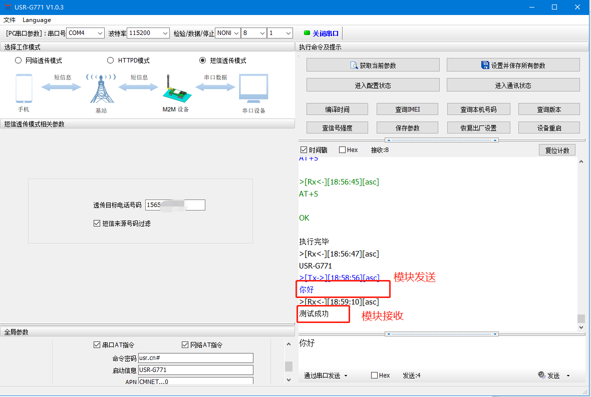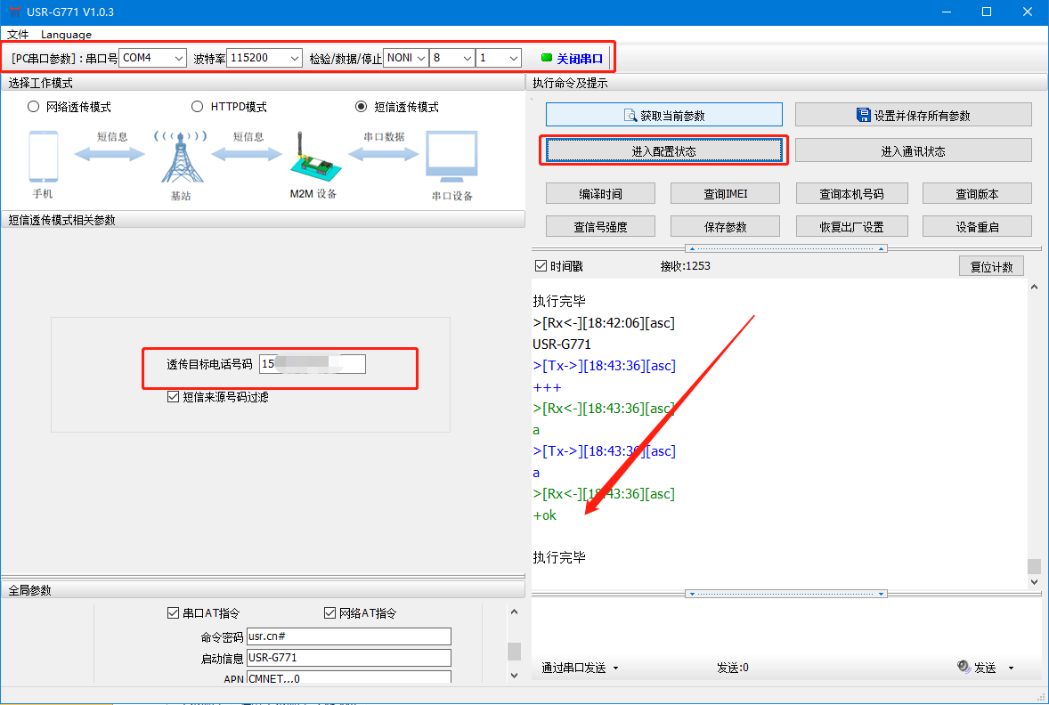 (2)打開串口——進入配置狀態——設置工作模式為短信透傳,設置目標手機號——設置并保存所有參數——串口打印開機信息說明設備重啟成功