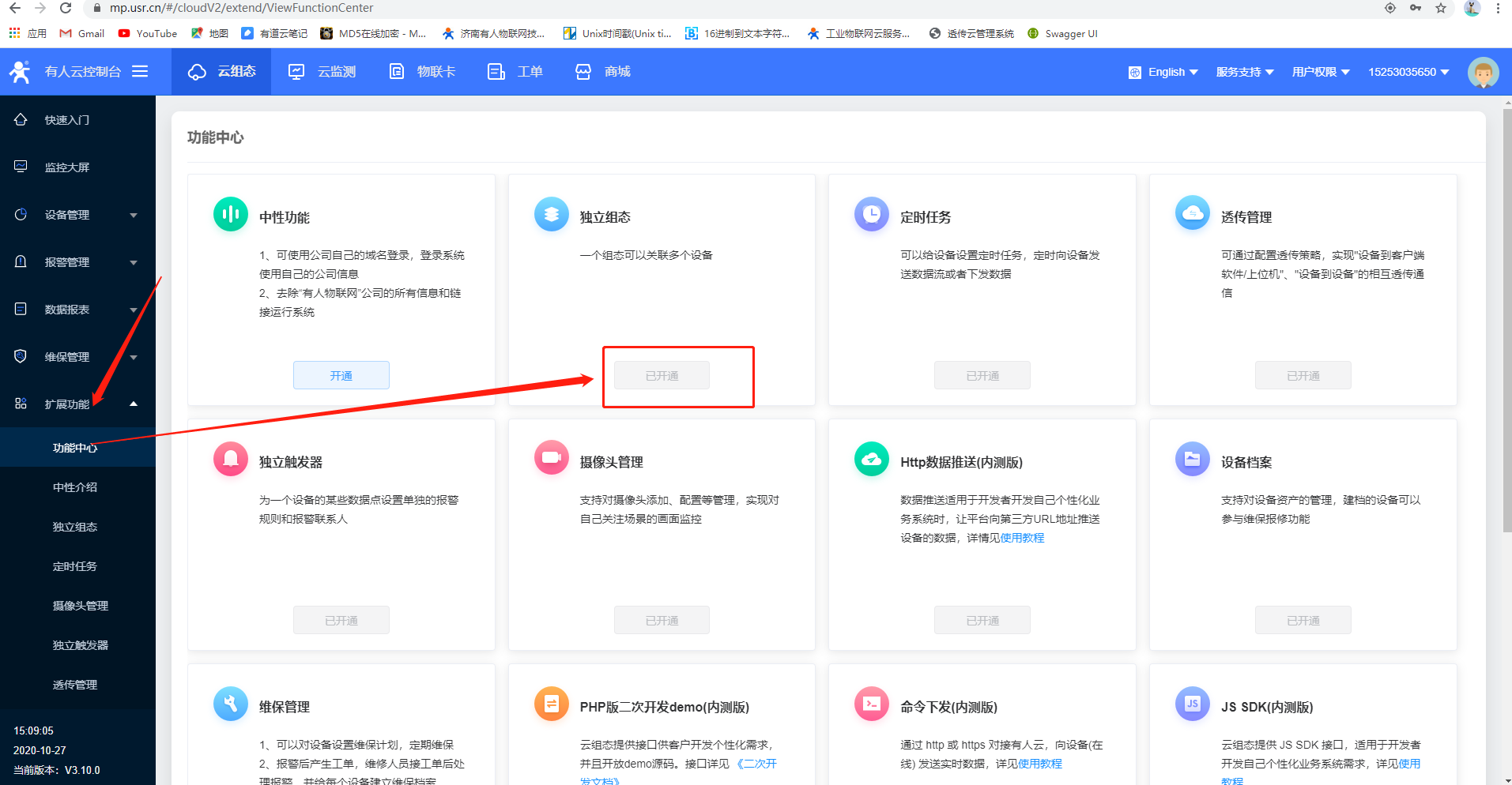 1.登錄有人云,擴展功能》功能中心》開通獨立組態