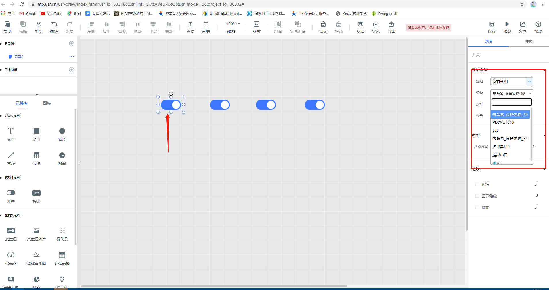 4.添加控件,一個組態畫面添加多個控件,可以同時關聯多個設備下的多個數據點,注意:獨立組態不支持監控大屏顯示
