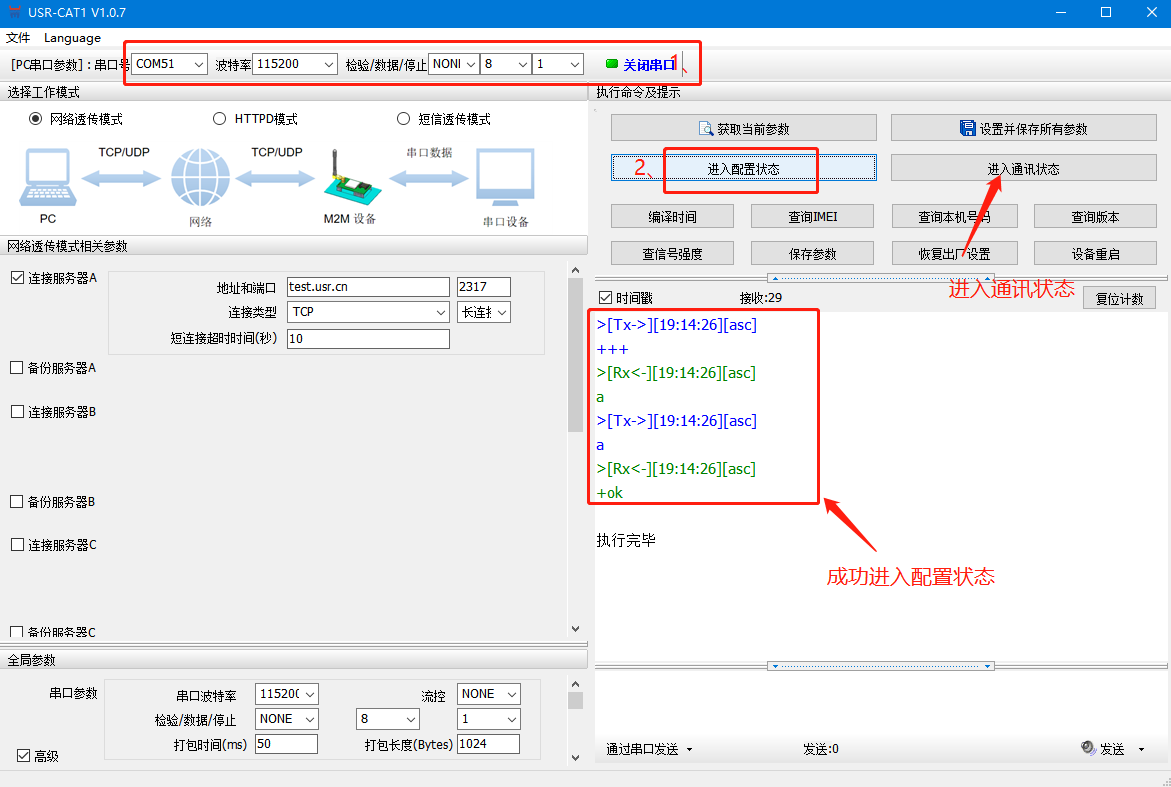 打開串口后,先點擊進入配置狀態,如果模塊能返回+ok的字符,說明電腦和模塊連接是沒有問題的;然后點擊進入通訊狀態,做數據通訊測試。