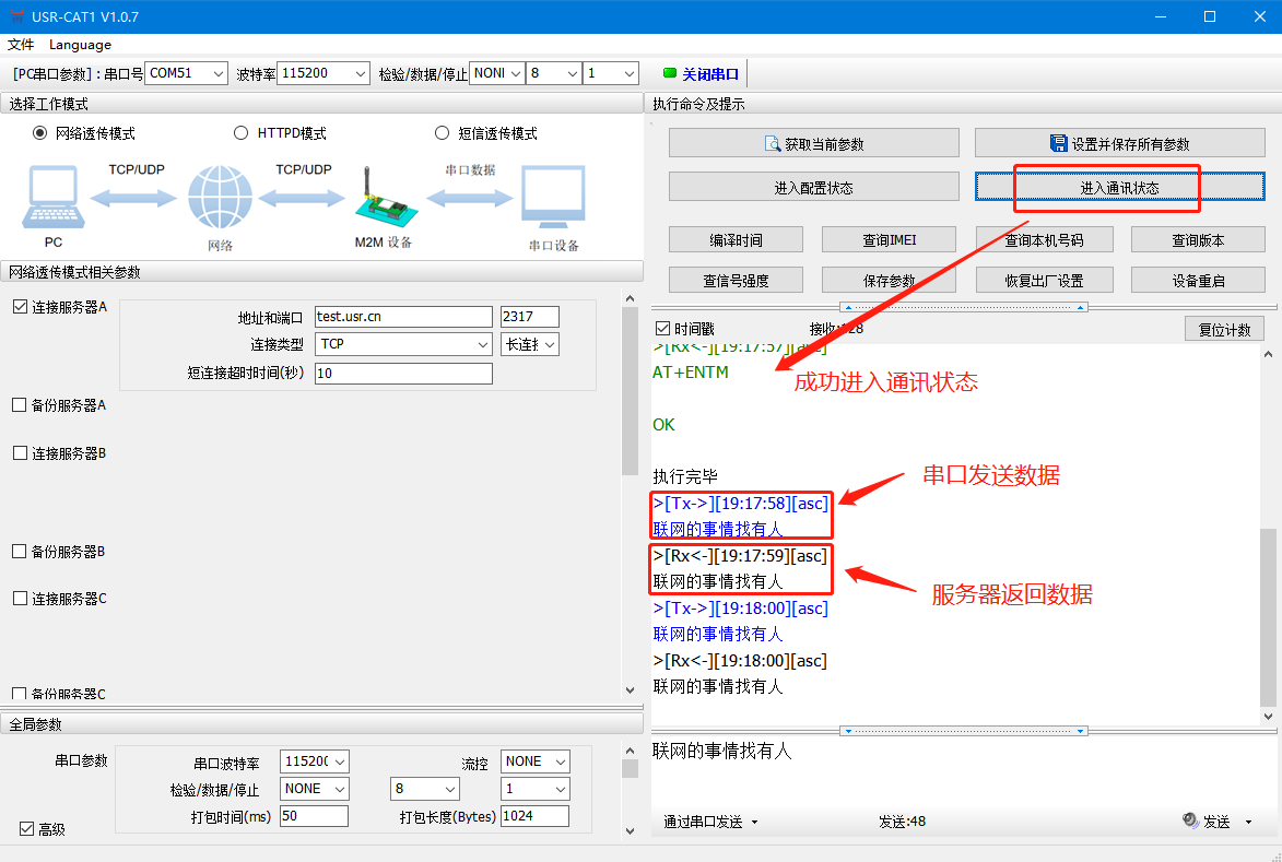 2、DTU出廠默認連接的是我司的測試服務器:test.usr.cn:2317;串口向服務器發送什么數據,服務器就將接收到的數據返回到串口。