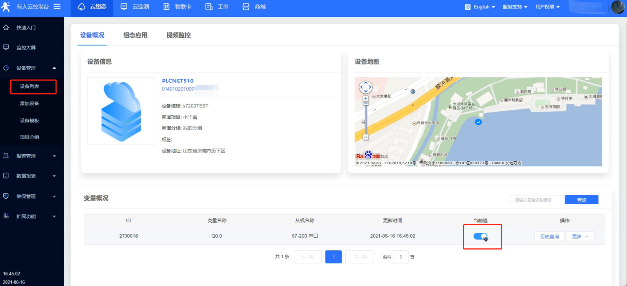 l 重啟完成后,觀察平臺數(shù)據(jù),采集成功(數(shù)據(jù)采集時請不要打開遠(yuǎn)程維護(hù)的透傳功能)