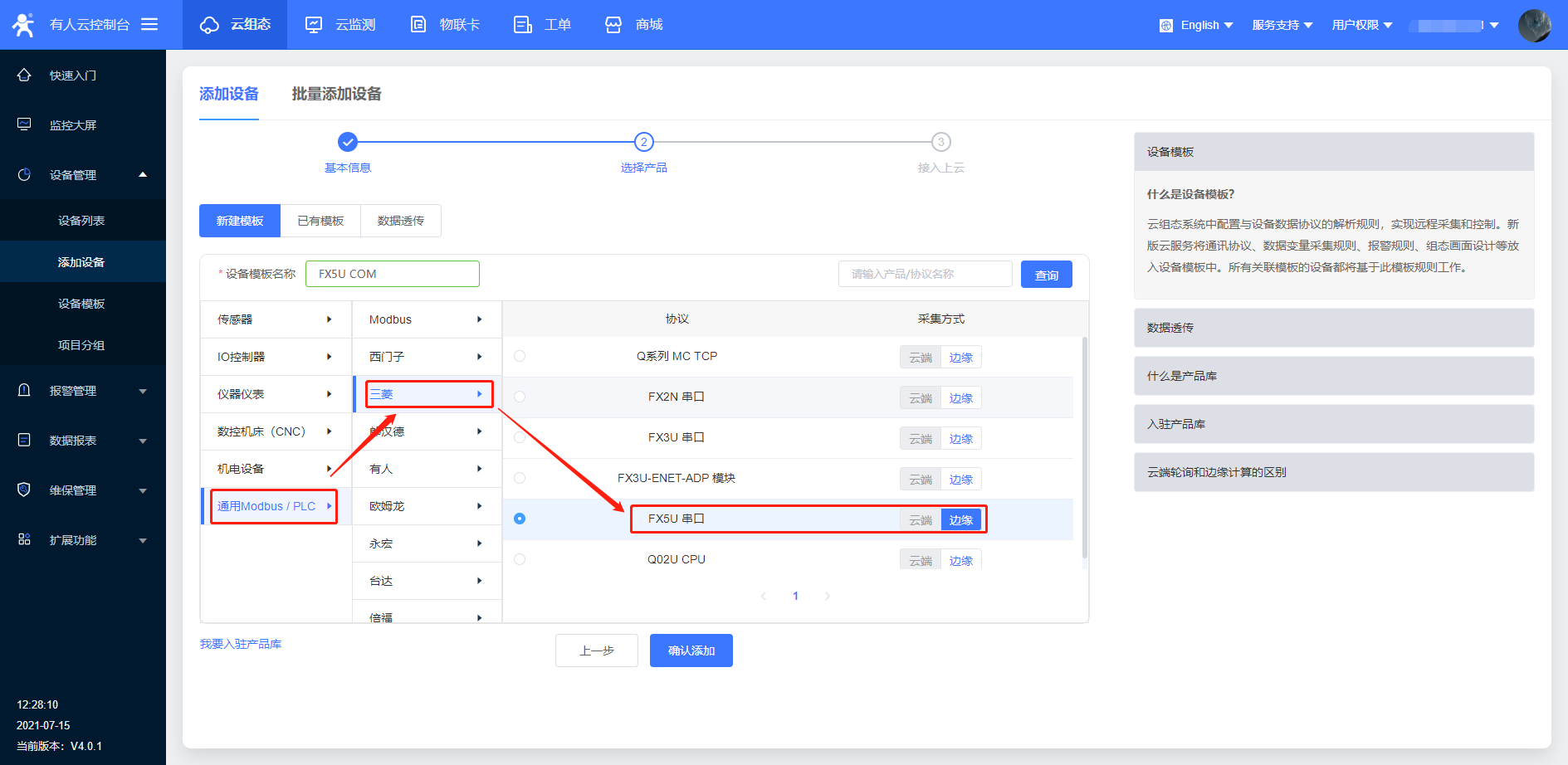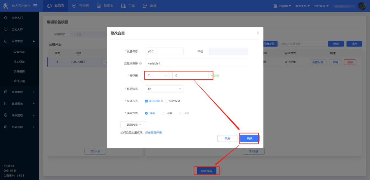 ? 添加從機和變量(請注意串口序號的對應,從機地址是PLC內部屬性),此處添加了一個Y寄存器;添加完成后點擊同步模板。