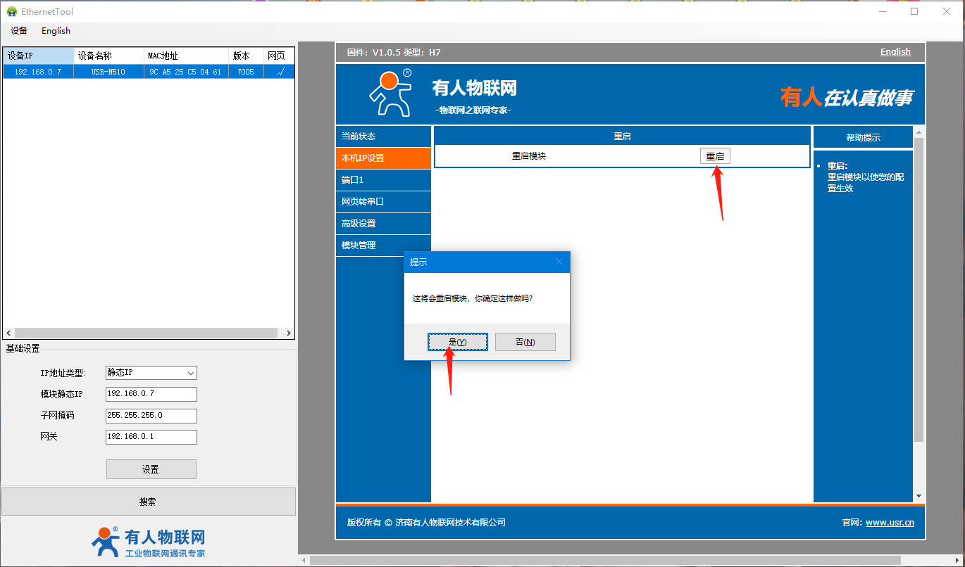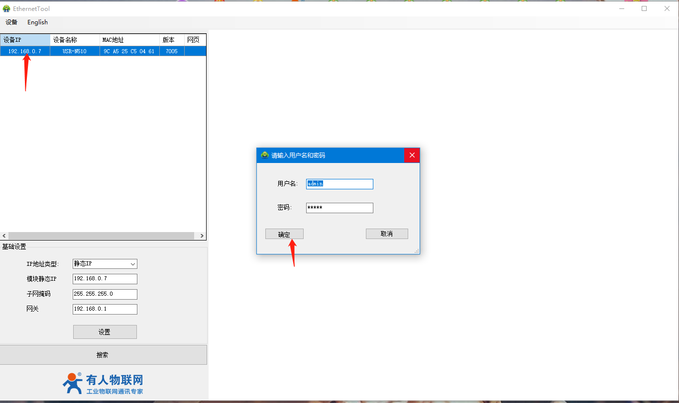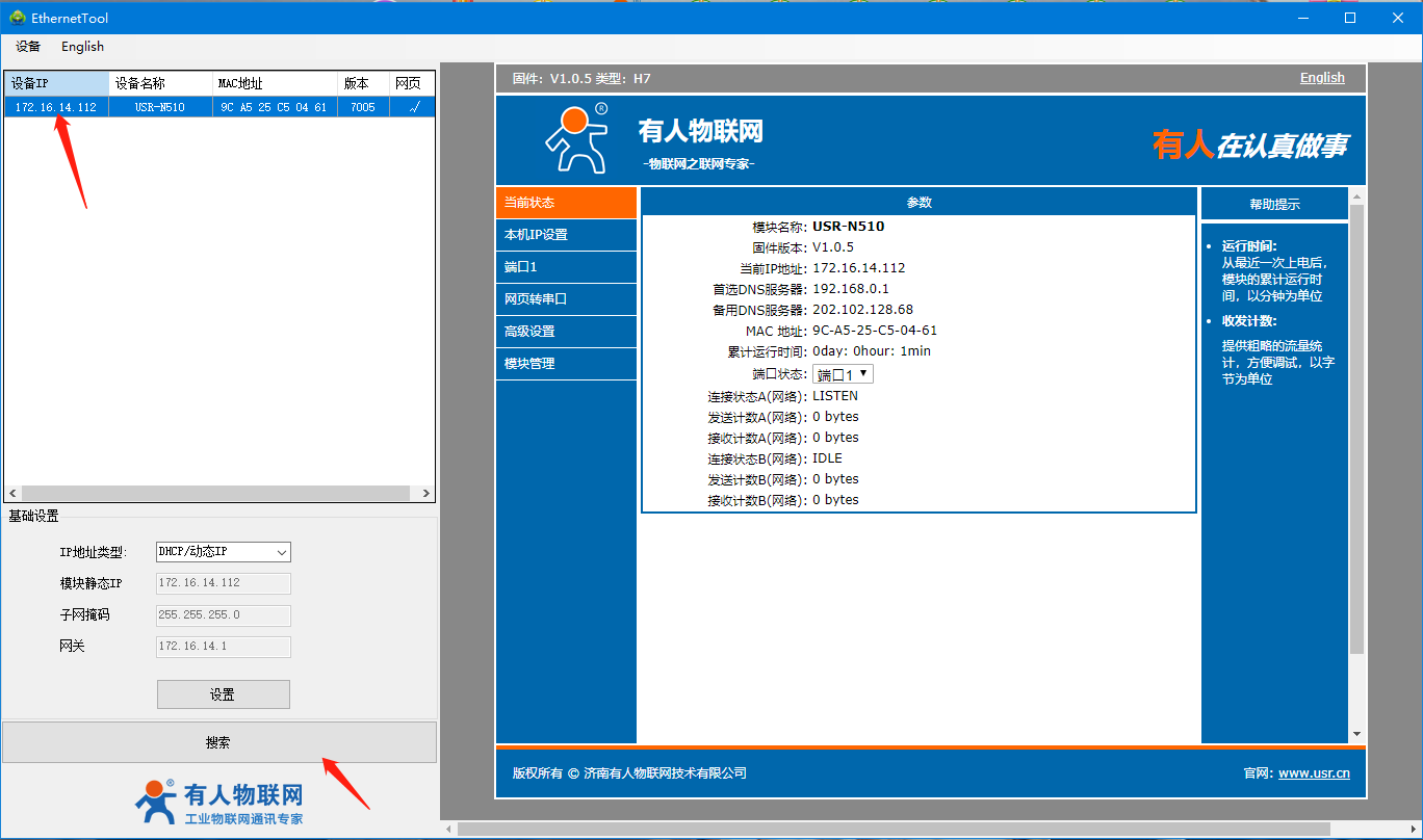 4、打開510(H7)系列設置軟件,點擊搜索設備,可以搜索到510,并且可以看到目前510的相關信息,IP為192.168.0.7(默認),設備名稱為:USR-N510,MAC地址為:9C A5 25 XX XX XX,版本為:7005。