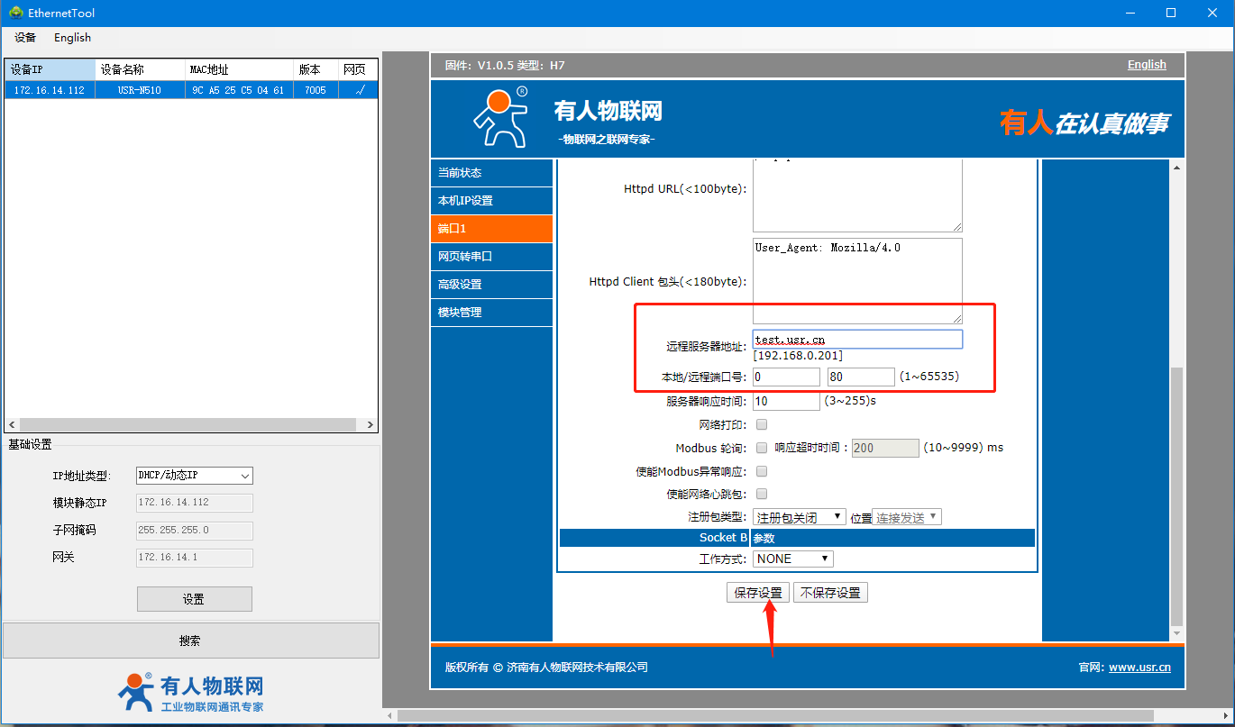 8、遠程服務器地址為:test.usr.cn,遠程端口為80。(這個是我司的測試服務器),參數設置無誤后點擊保存設置。