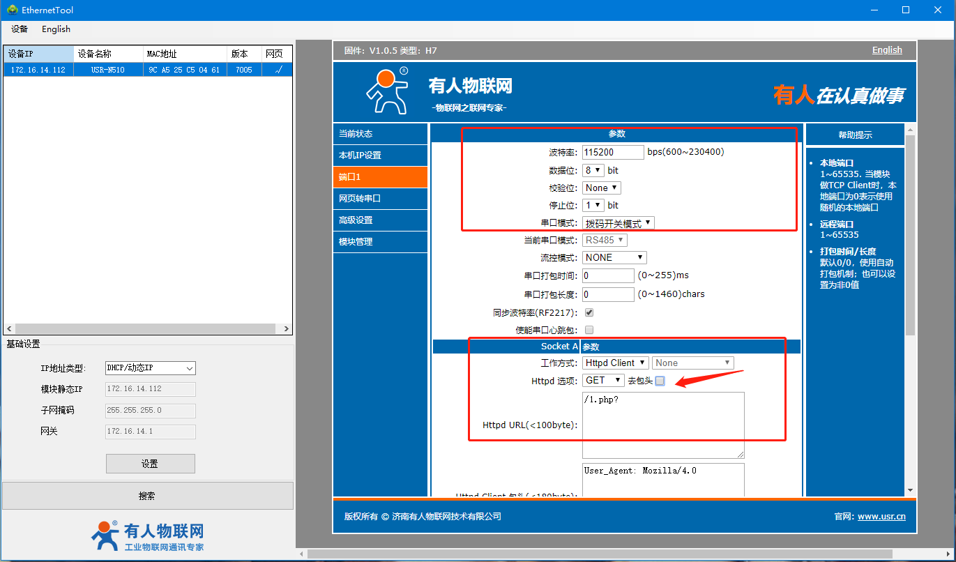 7、在端口1處,確認當前串口參數(默認為115288,N,8,1)以及串口模式(網頁設置優先級大于撥碼開關),默認為撥碼開關模式,所以我們需要將設備的撥碼撥到相應位置,設置模塊工作方式:HTTP client,HTTPD選項設置為GET,點擊去包頭,最后我們獲取到的數據將不會存在包頭,URL為:/1.php? 。