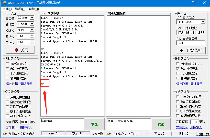 發送data=123,收到返回數據123