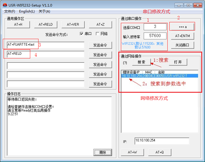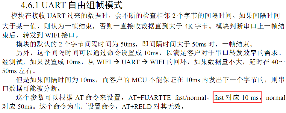 發送AT+FUARTTE=fast。 然后再發送AT+RELD使指令生效,注:改指令需要恢復出廠設置才能生效,設置完成支持請重新設置WiFi模塊的參數。