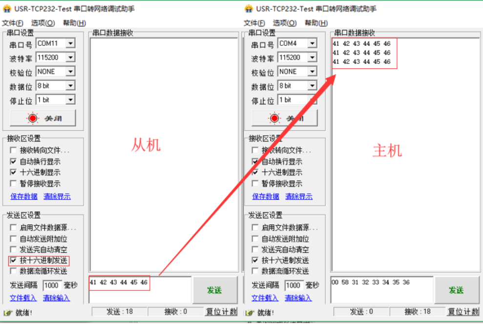 啟動兩個USR-TCP232-Test(模擬串口設(shè)備1,2)分別連接LoRa數(shù)傳終端A、B的串口,使用串口設(shè)備1發(fā)送數(shù)據(jù)串口設(shè)備2可接收數(shù)據(jù)(反之亦然),