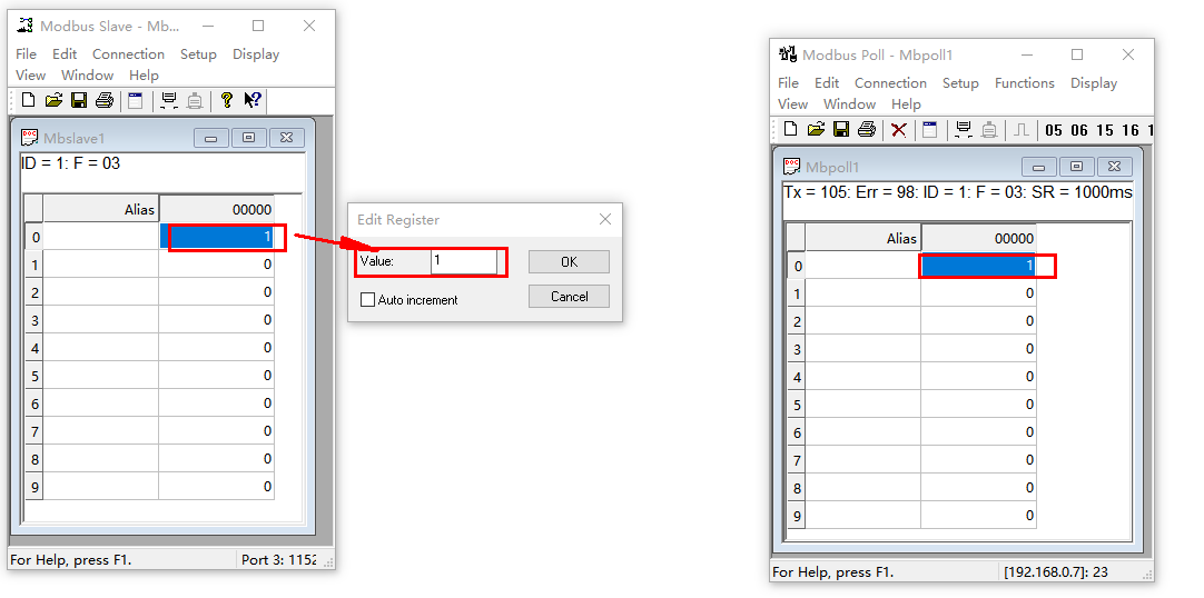 模擬測試用MODBUS SLAVE軟件做串口設備,用MODBUS POLL軟件做網絡端。