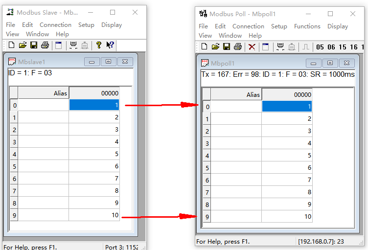 MODBUS SLAVE軟件和MODBUS POLL軟件的設備ID SLAVE ID需要設置一致,寄存器起始地址和寄存器數量設置一致。舉例,我用的是起始地址0,寄存器數量10。用的是03功能碼。