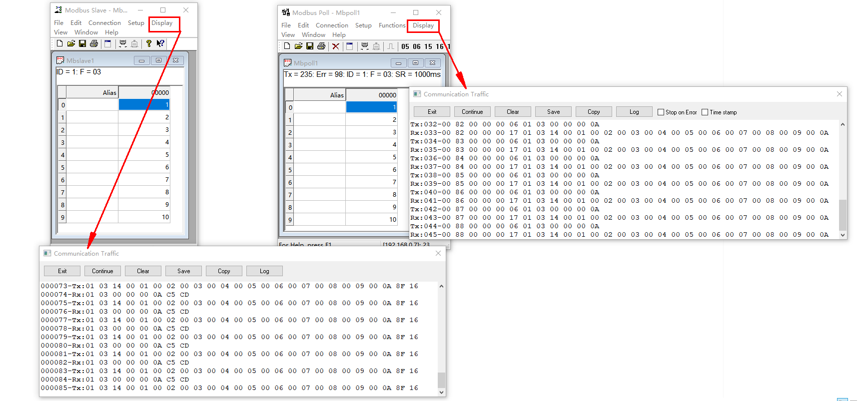 備注:MODBUS SLAVE軟件和MODBUS POLL軟件的選項Display,點開之后,最下面的Communication Traffic,是兩個軟件數據監控,可以查看MODBUS 數據,是否正常。