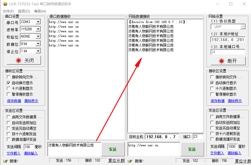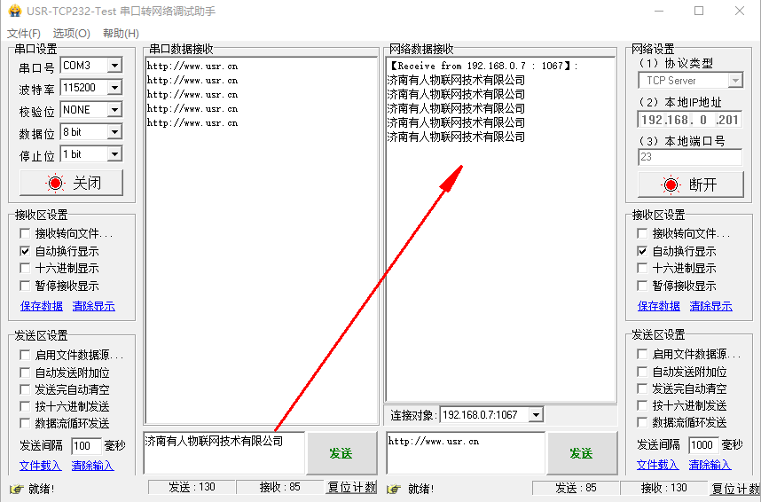網(wǎng)絡(luò)助手點(diǎn)擊連接,有連接對(duì)象之后,測試串口和網(wǎng)絡(luò)之間的數(shù)據(jù)傳輸。