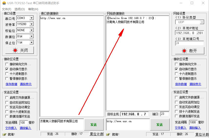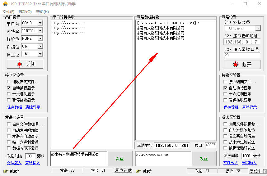 點擊連接,有連接對象之后,測試串口和網絡之間的數據傳輸。