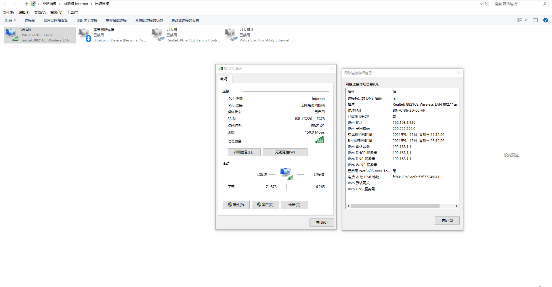 1、電腦連接USR-LG220-L的WiFi,可以從控制面板看到USR-LG220-L分配給電腦的IP和網關。關閉防火墻。