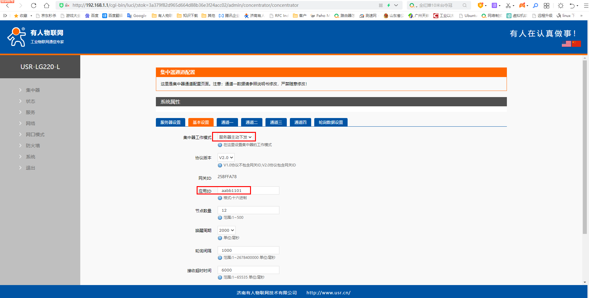 AID應用ID設置為aabb1101,設置和USR-LG220-L的應用ID一致。