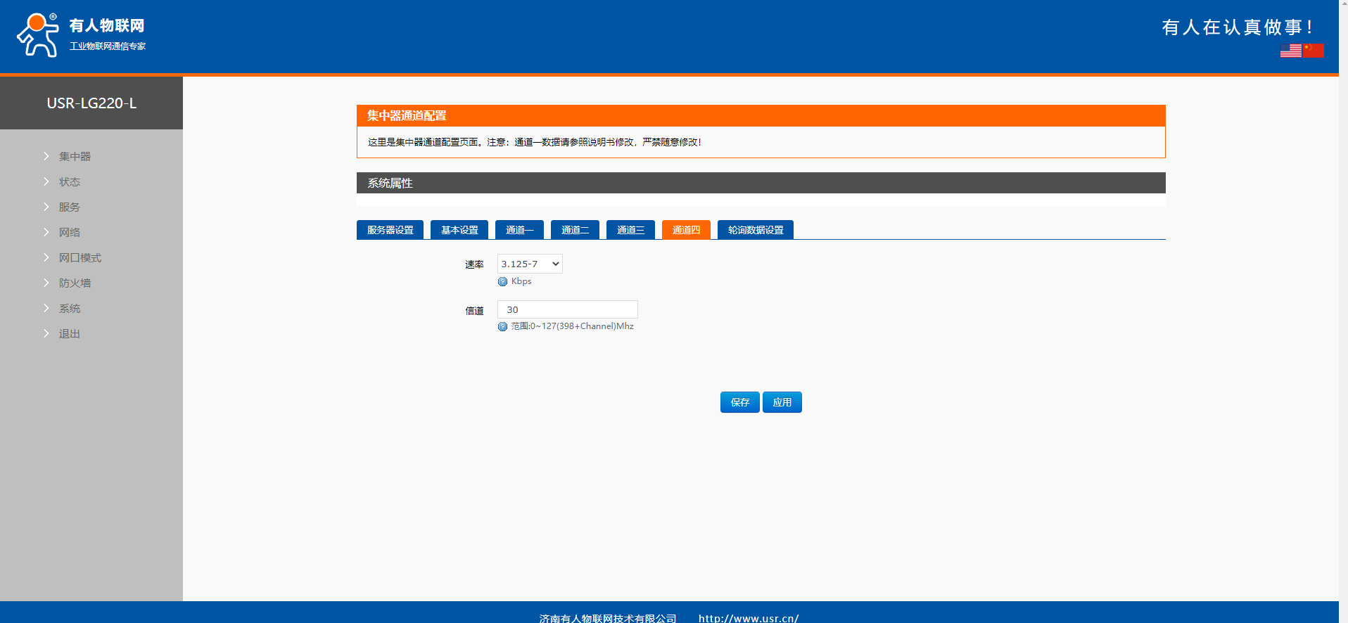 3、修改USR-IO34-LR-C的空中速率等級,設置為7。信道設置為35,和USR-LG220-L的通道一速率、信道保持一致。