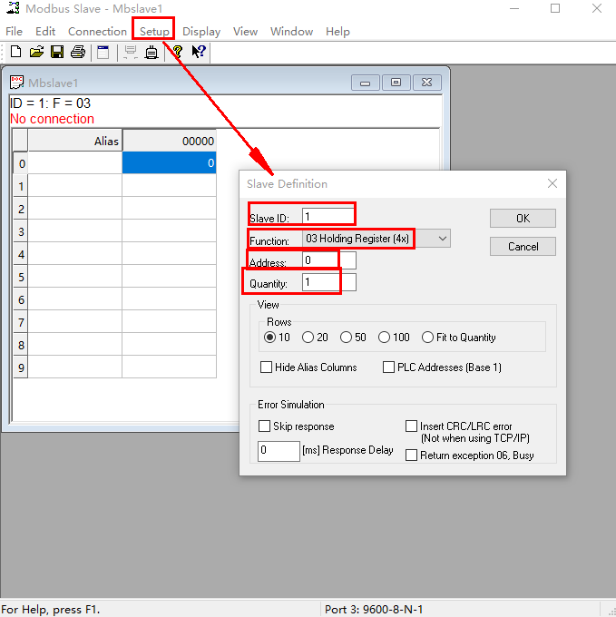 點擊Setup,設置從機地址,Slave ID 設置485從機地址1,Function用03功能碼,Address是寄存器起始地址用0,Quantity設置從寄存器起始開始的寄存器數量,用1。