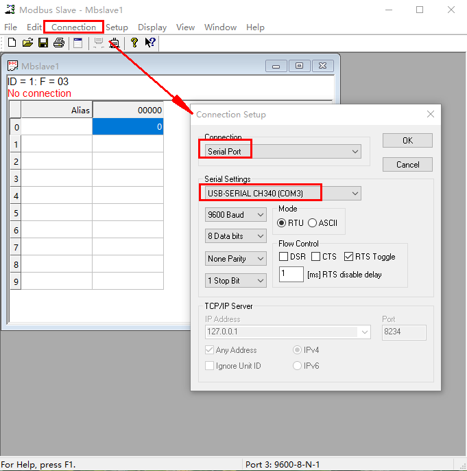 1、USR-IO34-LR-C 使用USB-RS485接電腦,電腦安裝并打開MODBUS SLAVE軟件,模擬MODBUS RTU 485串口設備。