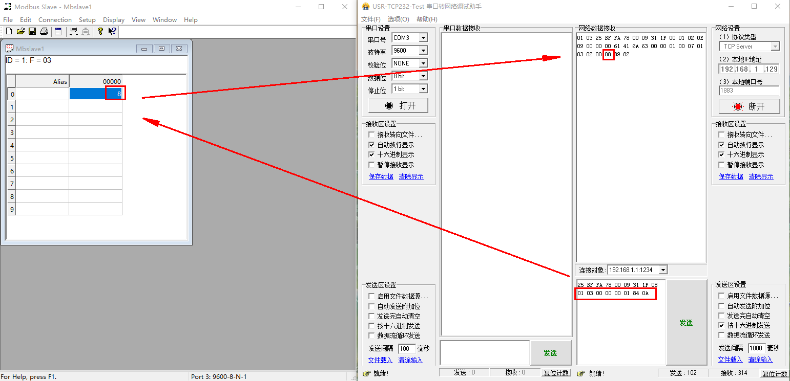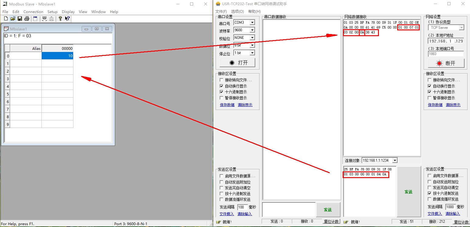 網絡端發送和接收都勾選十六進制顯示和接收,然后網絡端按照USR-LG220-L的服務器主動下發協議,輸入命令,去讀取USR-IO34-LR-C 接的485從機地址1,寄存器地址0的數據。