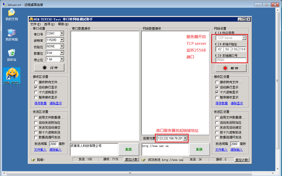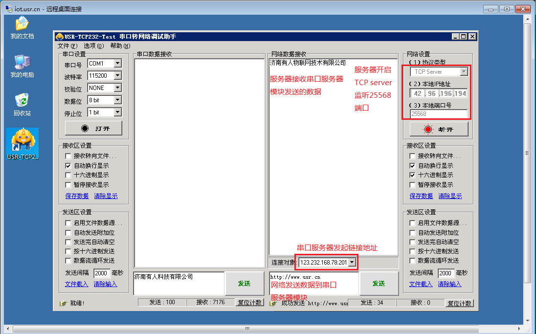 以上是服務器發送數據和接收數據:以下使用電腦串口連接WiFi串口串口,電腦運行串口調試軟件,進行發送和接收服務器的數據。