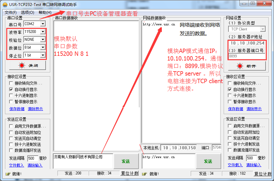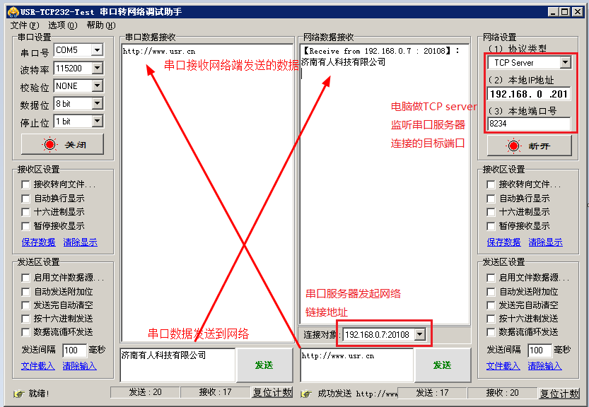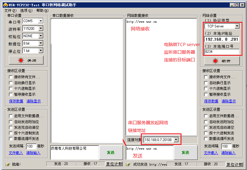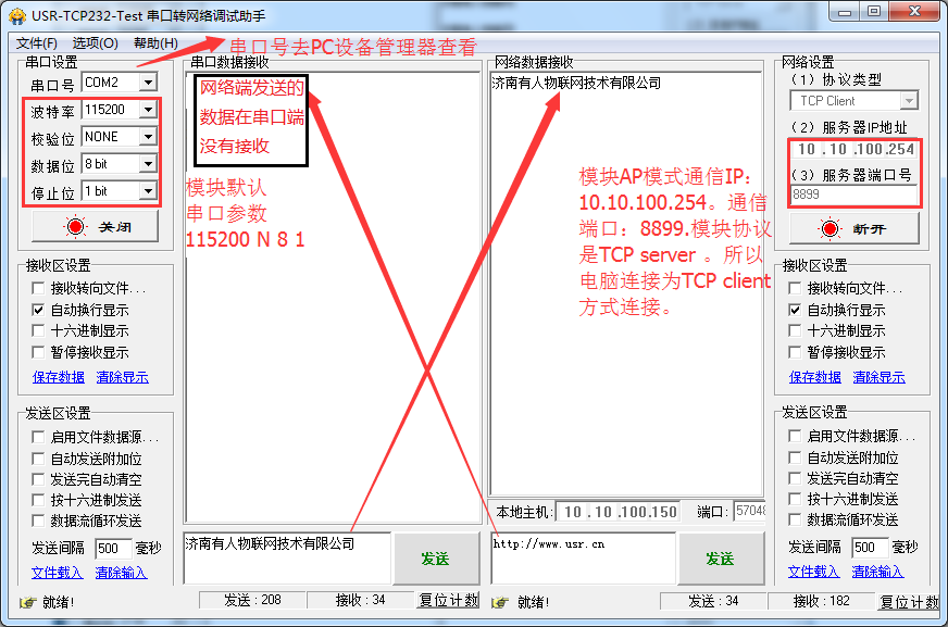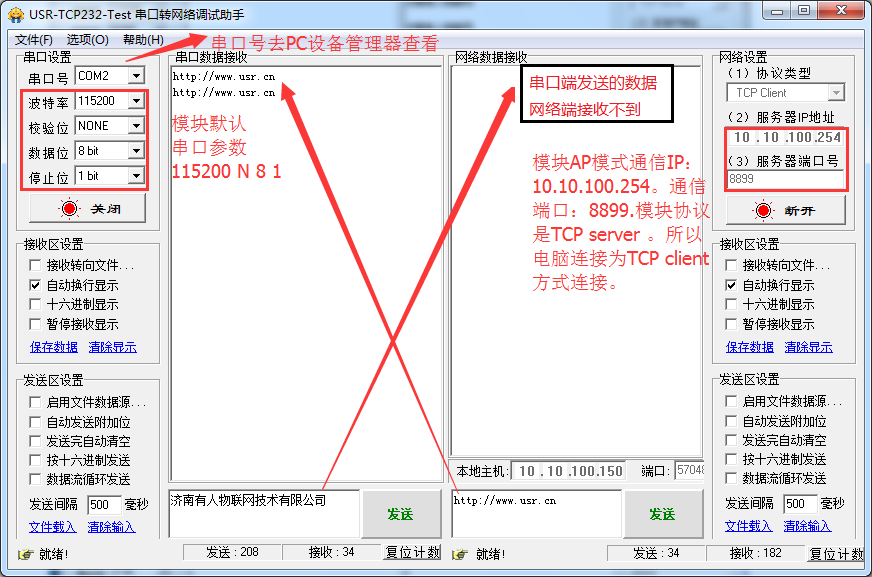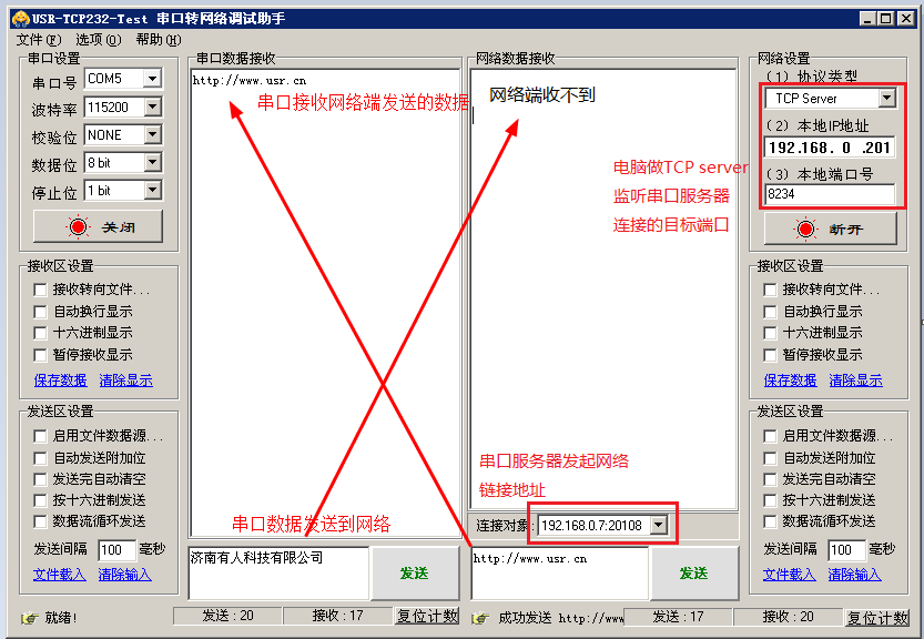 正常情況是這樣:串口發送數據,網絡接收,網絡發送數據,串口接收。