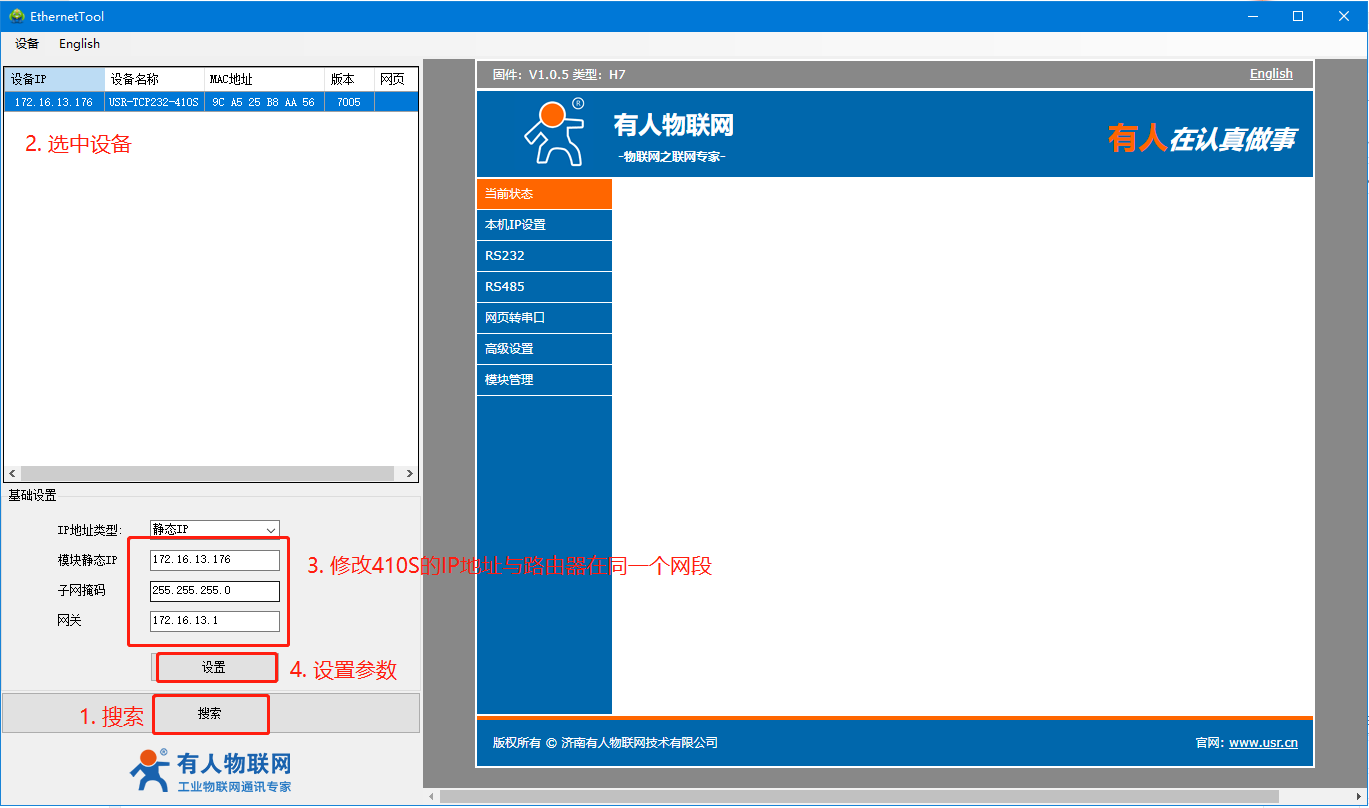 2>打開410S設置軟件,搜索---選中設備---修改IP地址--設置參數