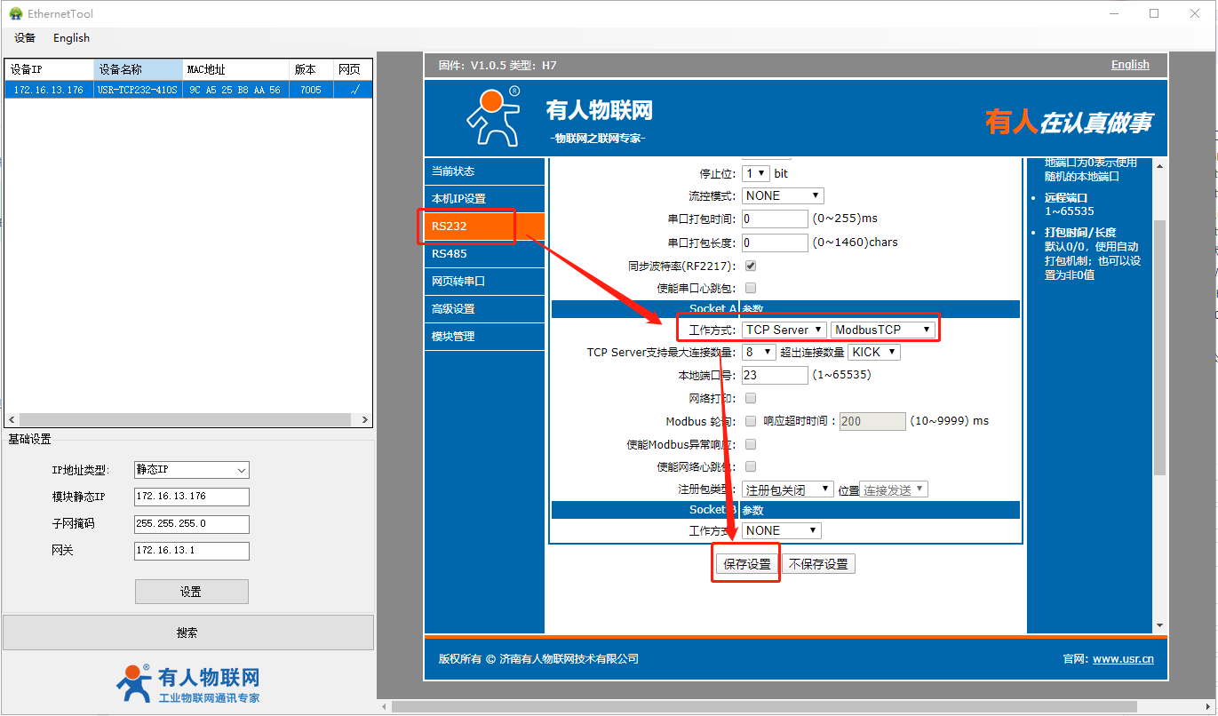 4>參數設置:RS232和RS485是獨立串口,可分別設置,本案例中用RS232口為例展示